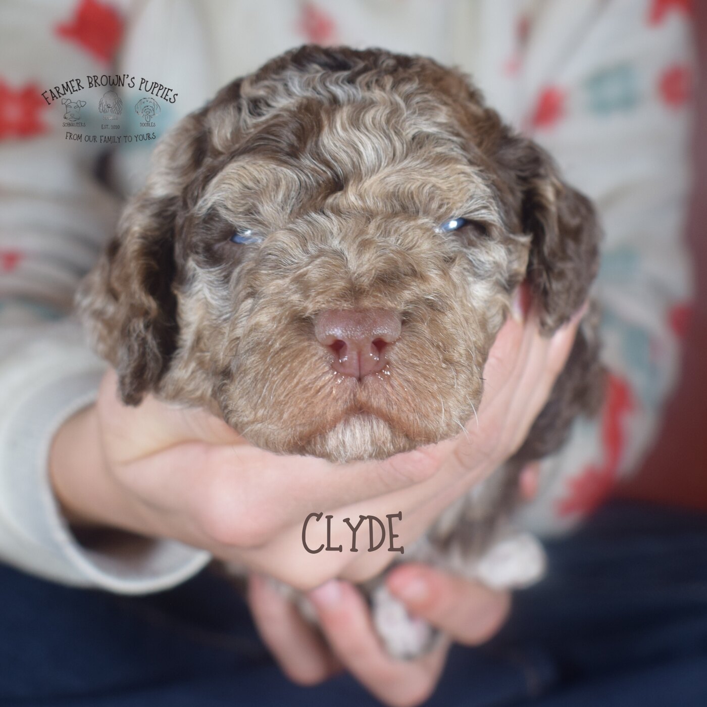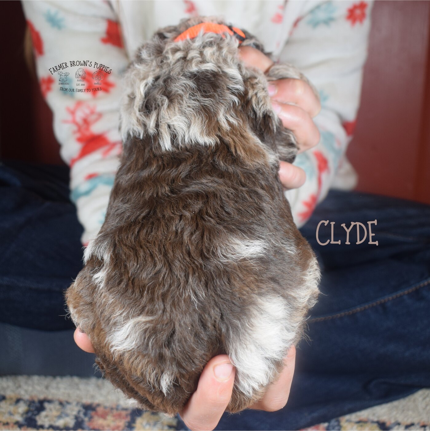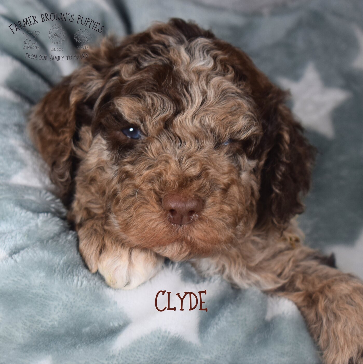 Clyde was born in and is being raised in our home with our eight children. He will be well-socialized and ready for anything when he goes home. While here with us, he will be dewormed regularly, receive his 6 and 8 week puppy shots, be microchipped, and get at least one hair cut. Clyde will also receive a thorough vet check around 6 weeks from Dr. Johnson, our family vet. Before going to his new home, he will be introduced to our potty tray system, which will give him a good foundation for housebreaking.